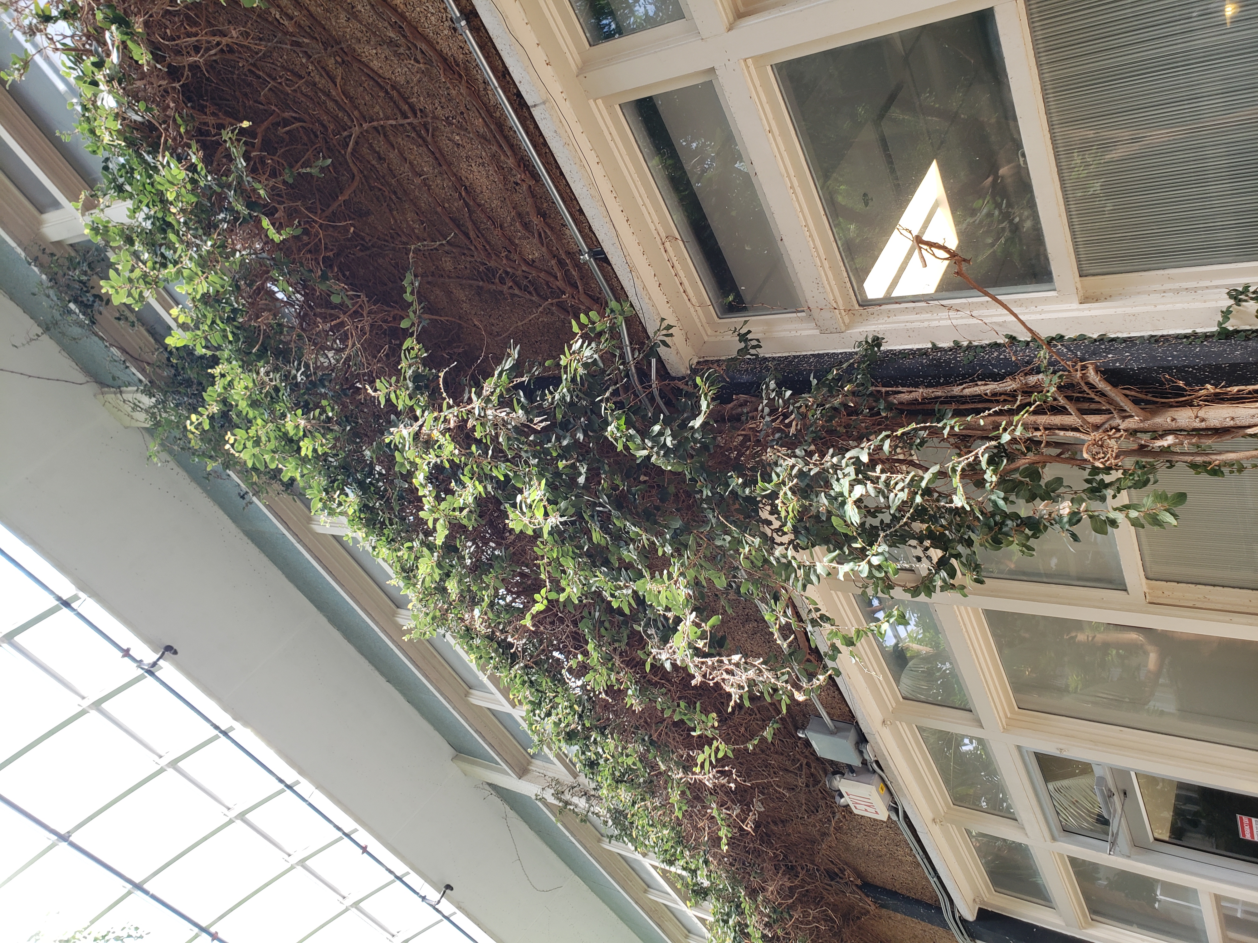 Ficus pumila is a woody evergreen liana, growing to 2.5–4 m (8 ft 2 in – 13 ft 1 in). It can grow up to 9–12 m (30–39 ft) tall if it isn't regularly pruned.[6] The juvenile foliage is much smaller and thinner than mature leaves produced as the plant ages. The leaves are oval, cordate, asymmetrical, with opposite veins. It is creeping or can behave like a liana and also climb trees, rocks, etc. up to 4 m in height or more. The aerial roots secrete a translucent latex that hardens on drying, allowing the sticks to adhere to their support https://en.wikipedia.org/wiki/Ficus_pumila