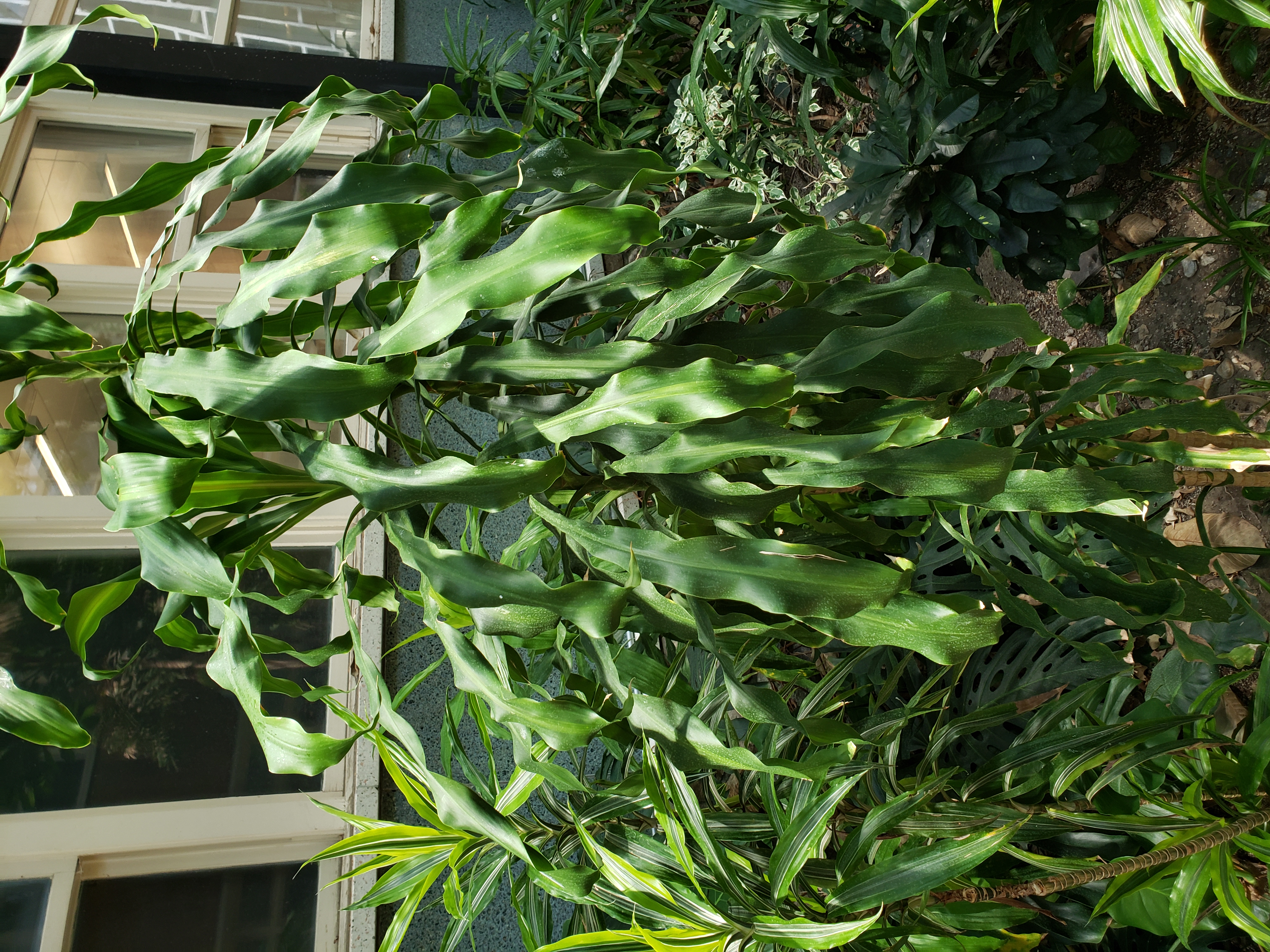 Dracaena fragrans is a slow growing shrub, usually multistemmed at the base, mature specimens reaching 15 m (49 ft) or more tall with a narrow crown of usually slender erect branches. Stems may reach up to 30 cm (12 in) diameter on old plants; in forest habitats they may become horizontal with erect side branches. Young plants have a single unbranched stem with a rosette of leaves until the growing tip flowers or is damaged, after which it branches, producing two or more new stems; thereafter, branching increases with subsequent flowering episodes.[1][3] If a stem is damaged, it will ooze red latex.[4] The leaves are glossy green, lanceolate, 20–150 cm (7.9–59.1 in) long and 2–12 cm (0.79–4.72 in) wide; small leaves are erect to spreading, and larger leaves usually drooping under their weight. The flowers are produced in panicles 15–160 cm (5.9–63.0 in) long, the individual flowers are 2.5 cm (0.98 in) diameter, with a six-lobed corolla, pink at first, opening white with a fine red or purple central line on each of the 7–12 mm (0.28–0.47 in) lobes; they are highly fragrant, and popular with pollinating insects. The fruit is an orange-red berry 1–2 cm (0.39–0.79 in) diameter, containing several seeds. https://en.wikipedia.org/wiki/Dracaena_fragrans
